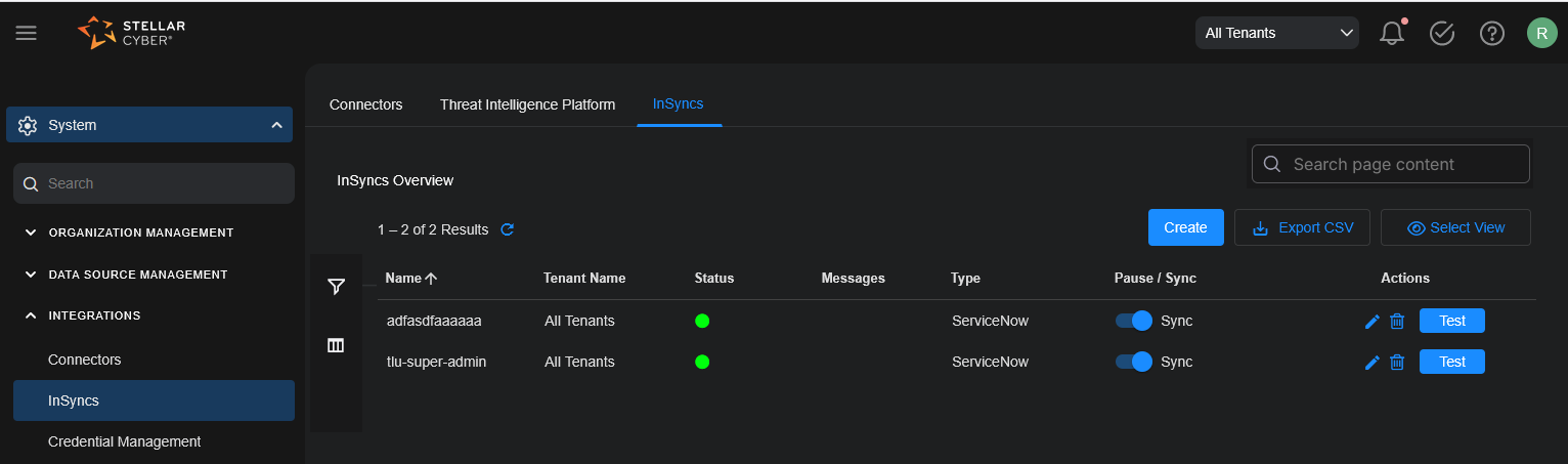Synchronizing an alert or a case from Stellar Cyber to ServiceNow is fully automated. It is based on the configuration detailed in Configuring InSyncs. As an example, during configuration you select the tenant that you want to synchronize, then, if there is a new alert or a new case belonging to that tenant, it will be synchronized with ServiceNow automatically.