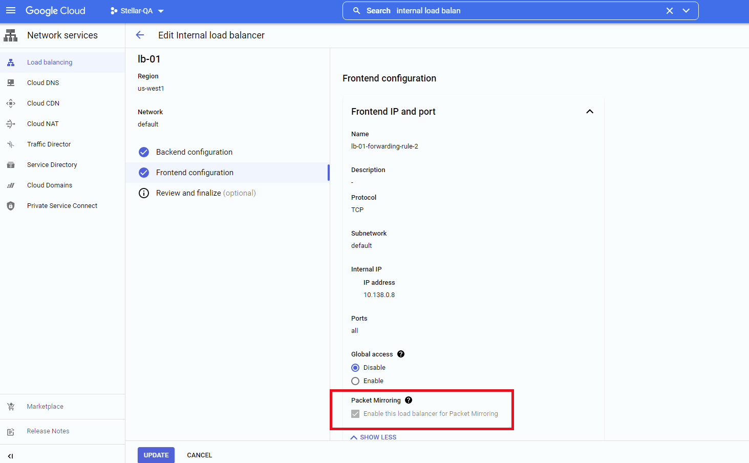 The GCP documentation describes how to set up Packet Mirroring. The following procedures provide an example specific to a Stellar Cyber deployment.