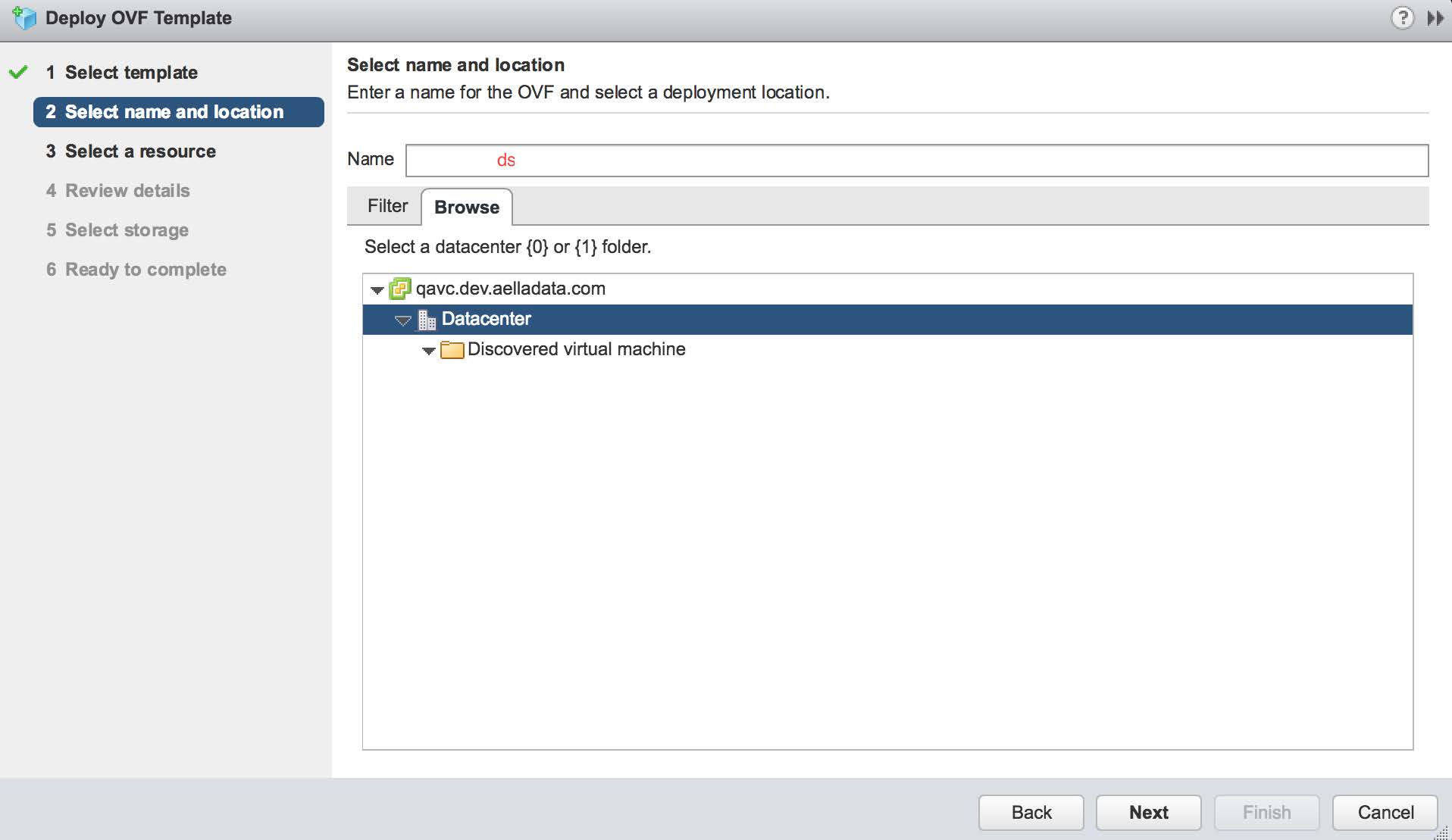 On the next screen provide the VM a name and select the appropriate data center where it will be deployed, as shown below: