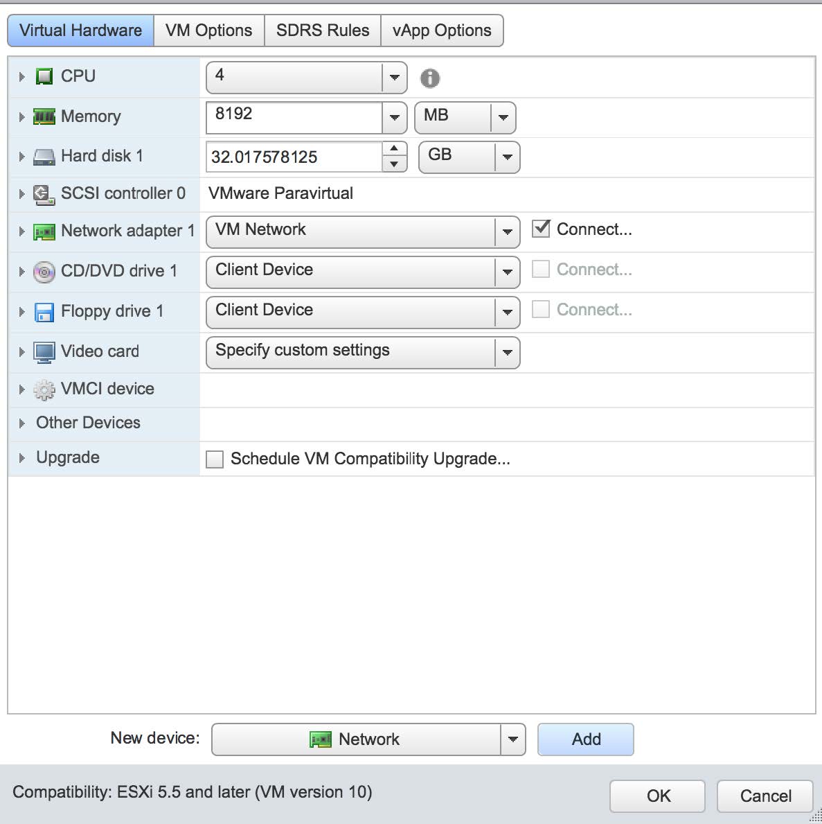Expand the Virtual Hardware sub-page. The Management channel used by the sensor is implemented over "Network Adapter 1" which needs to be connected. Select it as shown in the following image: