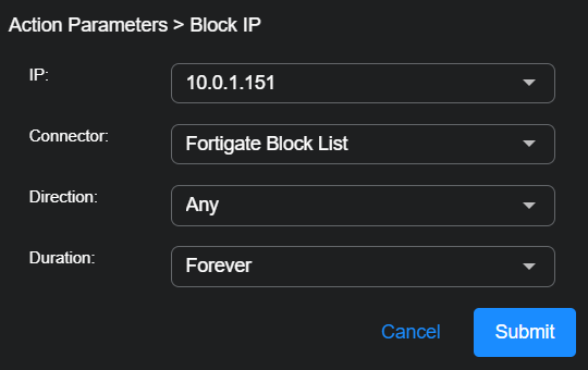 Stellar Cyber prepopulates the configuration wizards for case actions with the data corresponding to the case. For example, when configuring a Block IP action, the IP drop-down list automatically lists just those IP addresses associated with the case. You can always type in your own address, but the most relevant ones are already listed for you.