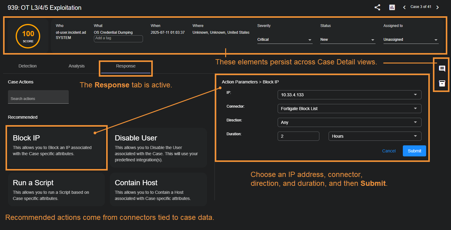The Case Details Response tab is where you take action on a case based on your triage and analysis in the Detection and Analysis tabs. Stellar Cyber automatically recommends actions to you based on the case's specifics and the connectors providing data for the observables in the case. For example, if a firewall provided the data for a host in your case, the Response tab typically includes a Block IP action for that host.