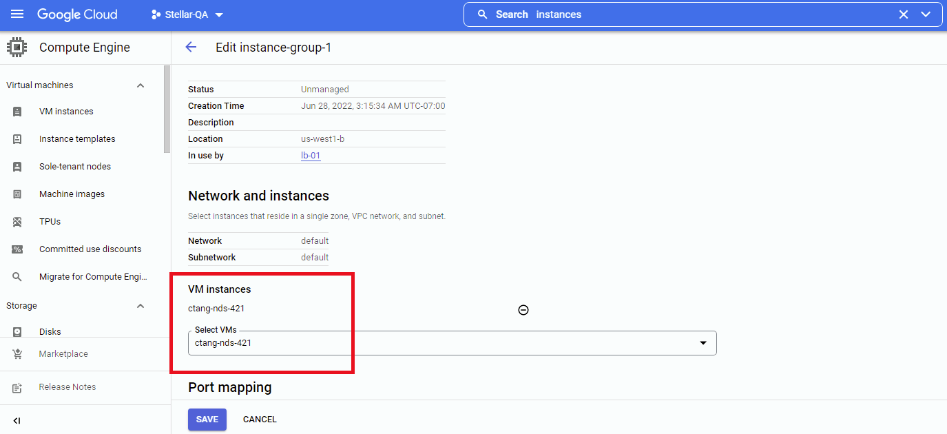 Select the New unmanaged instance group option and set the options illustrated below. Note that the only VM Instance in the Instance Group is our NDS, ctang-nds-421.