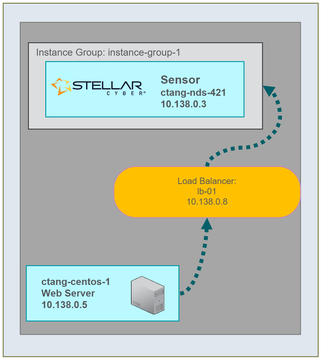 The procedures in this section set up the simple packet mirroring configuration illustrated belowm with all components residing in the same network (mirrored VM, load balancer, destination sensor, and associated DP).