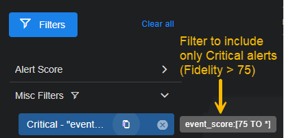- The number on the left reports the number of critical alerts within the current filters. These alerts have been scored by machine learning services with a Alert Score of 75 or greater and are most likely to need immediate attention.