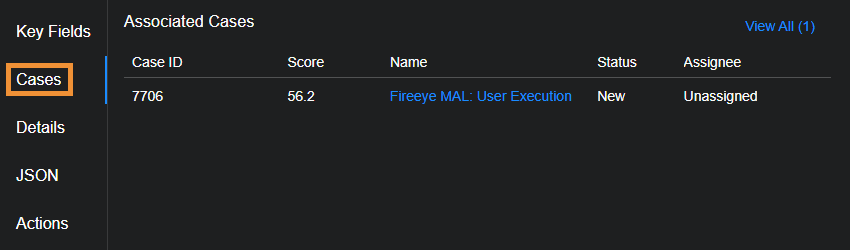 Cases associated with the event are listed here in descending order by score, up to a maximum of five. Typically, only one or two cases are associated with a given alert. Use the Cases list as follows: