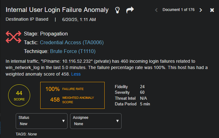 Alert Score – This number appears in a circle that is color-coded for severity, to match its position on the kill chain. The higher the score, the more important it is. The score is also based on Stellar Cyber's Machine Learning model, which compute the Fidelity, Severity, and Threat Intel scores that contribute to this overall score.
