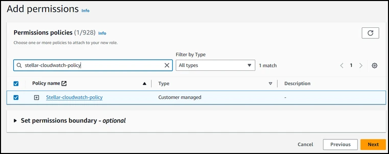 13. Select the checkbox to the left of the policy name, then choose Next.