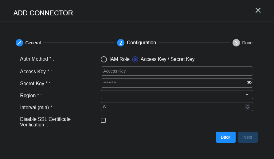 • For Access Key / Secret Key Auth Method: Access Key and Secret Key, plus Region