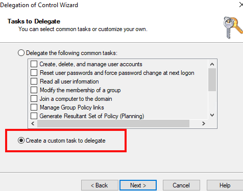 5. In the Delegation of Control Wizard, select the radio button for Only the following objects in the folder.