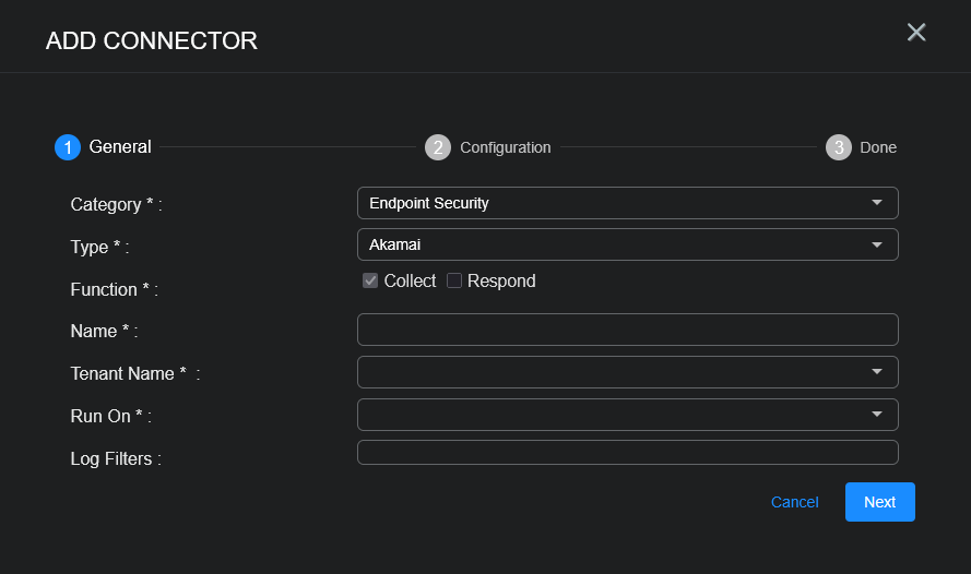 After completing the previous section, with the required credentials noted, you can add the Akamai connector in Stellar Cyber: