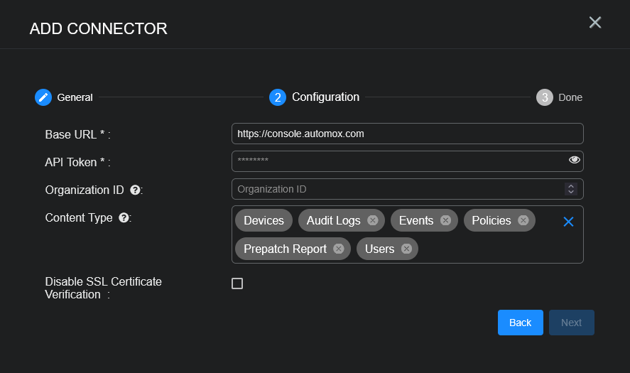 To add an Automox connector in Stellar Cyber: