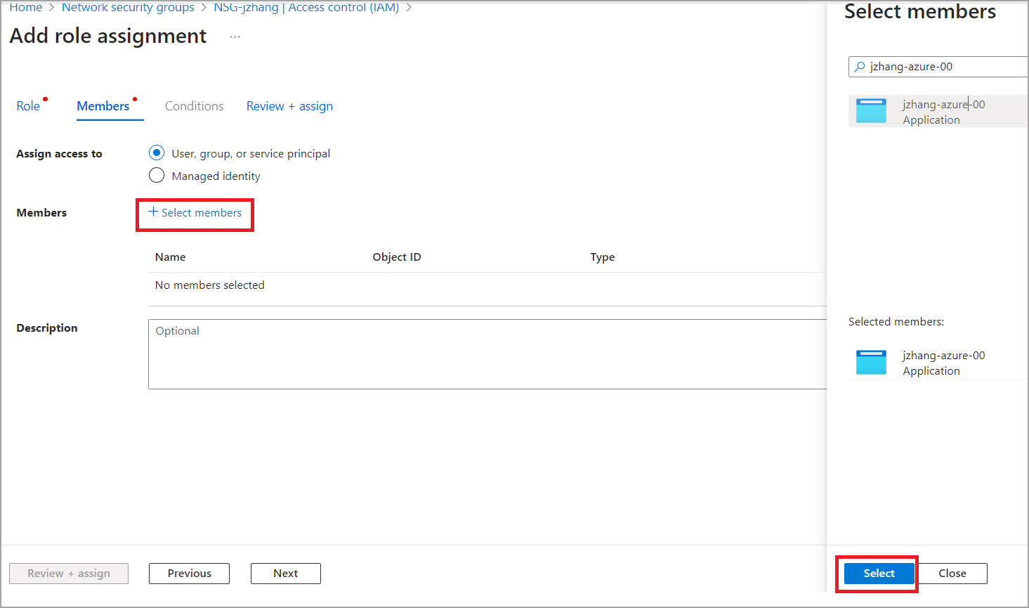 8. In the Select members page, select the previously registered app and click Select. It appears in the Add role assignment page.
