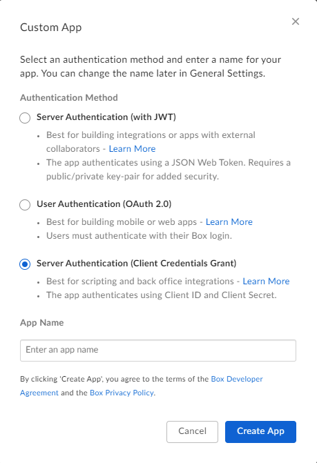 3. Select the Server Authentication (Client Credentials Grant) option, supply an App Name, and click Create App.