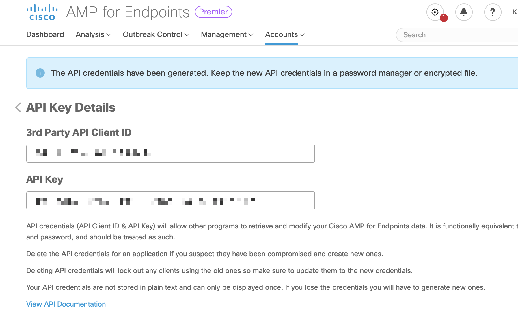 6. Click Create. The API credentials are immediately generated and the API Key Details page appears.