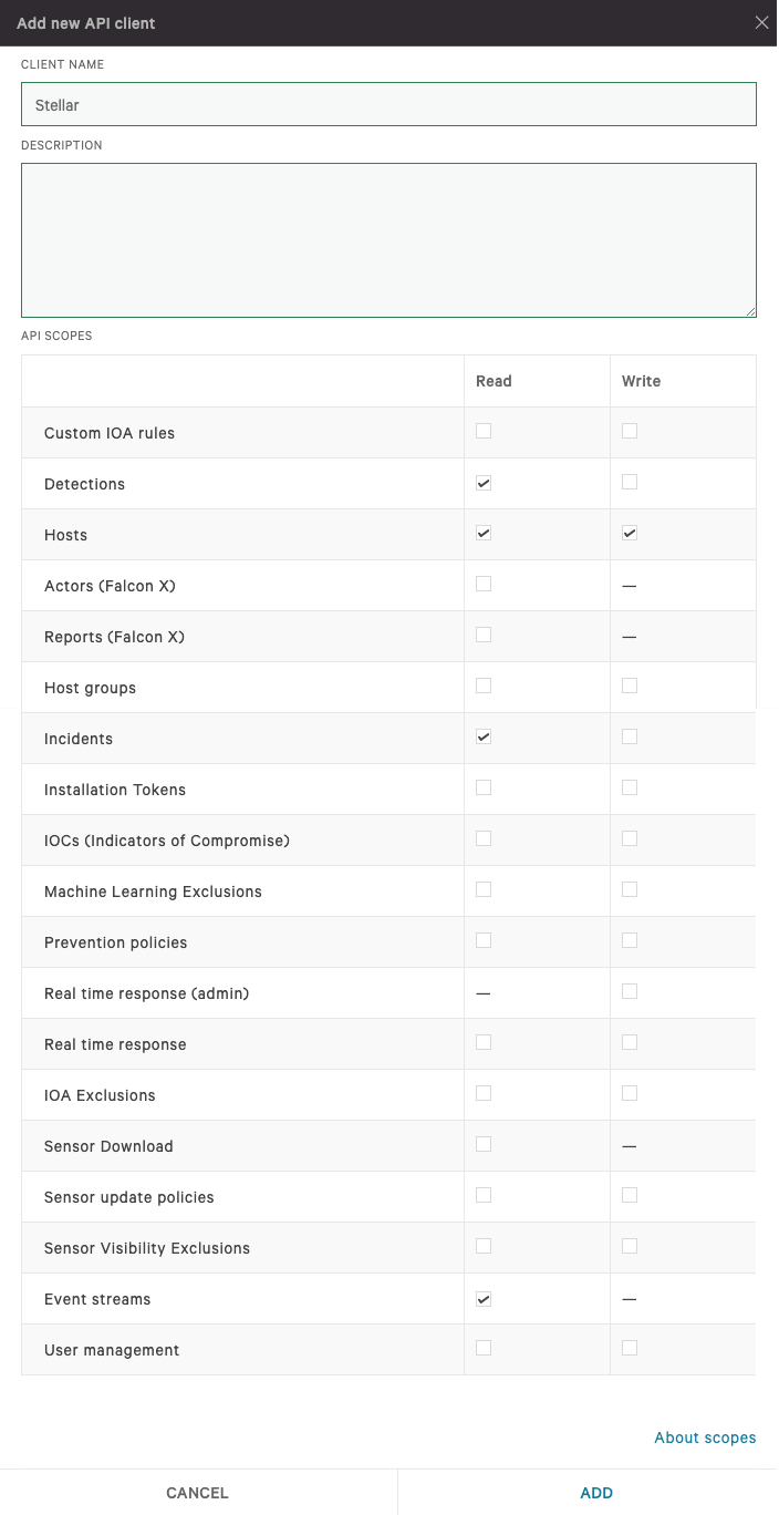 1. Generate the CrowdStrike Falcon API key you will use in Stellar Cyber