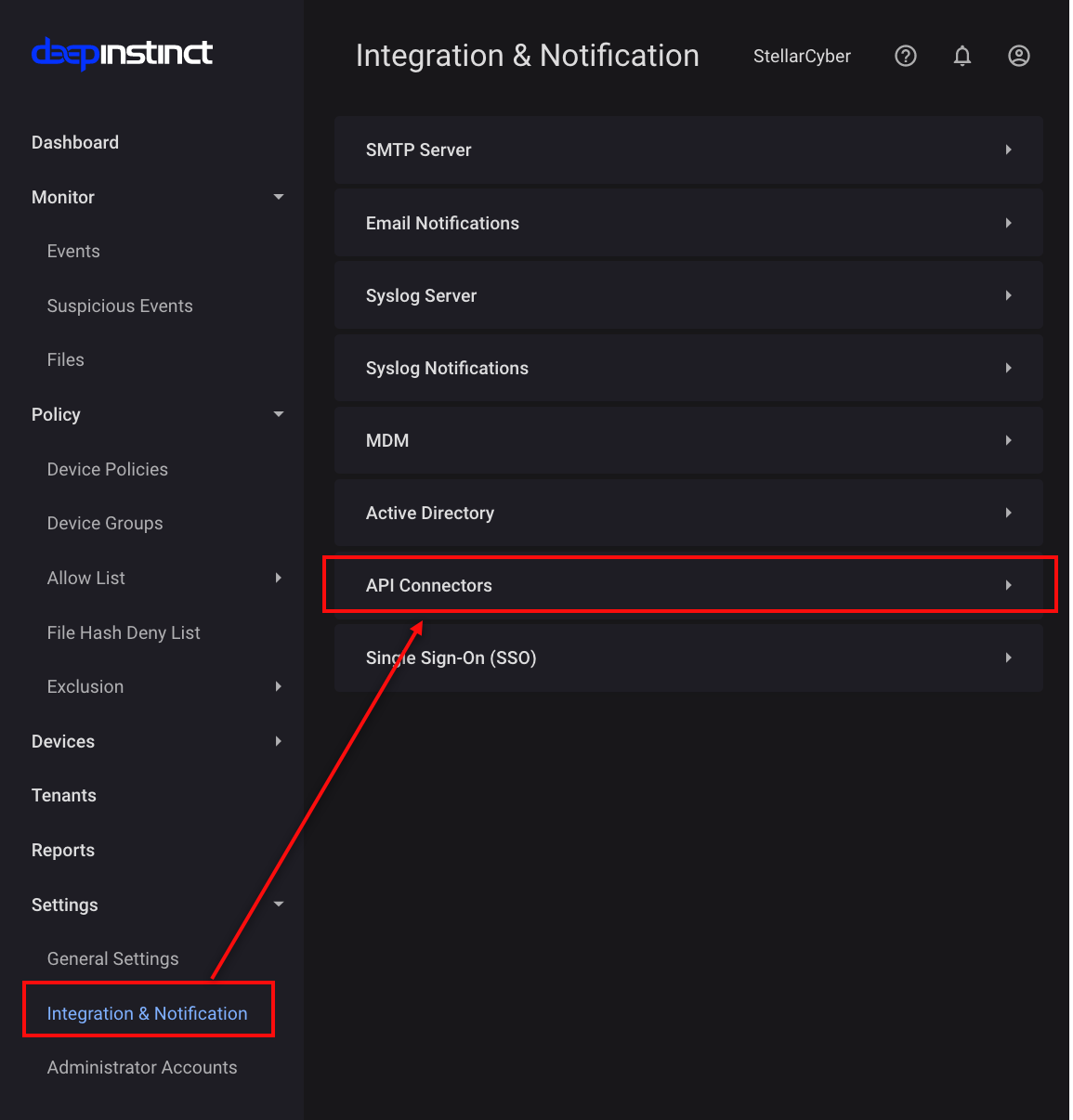 To add the Deep Instinct connector in Stellar Cyber: