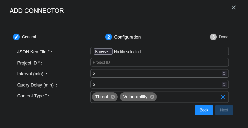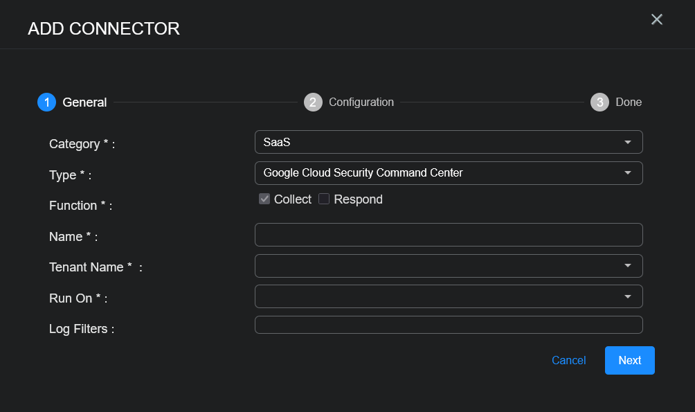 To add a Google Cloud Security Command Center connector in Stellar Cyber:
