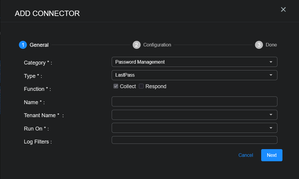 To add a LastPass connector in Stellar Cyber: