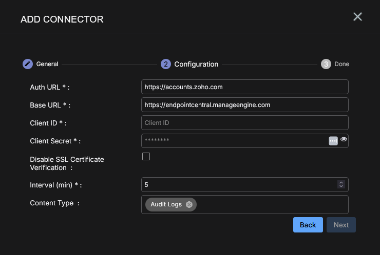 • Client ID and Client Secret—The generated credentials. Follow the guidance in the Manage Engine Endpoint Central documentation in the Authentication section for generating the Client ID and Client Secret.