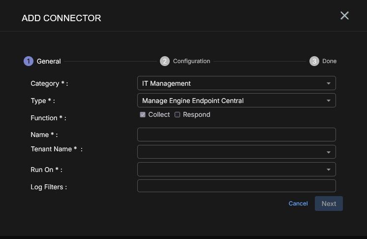 To add a Manage Engine Endpoint Central connector in Stellar Cyber: