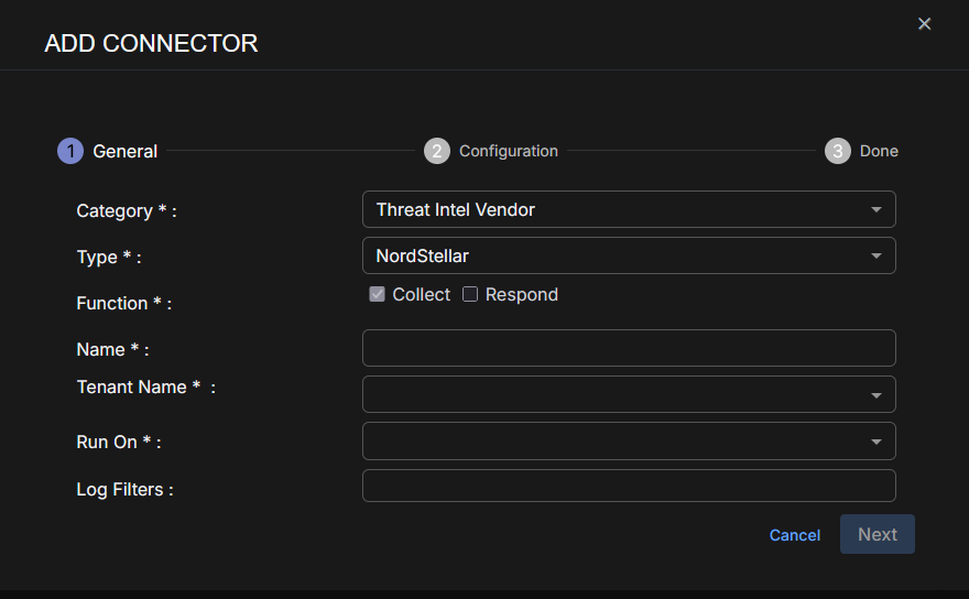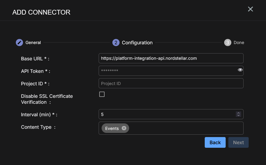 This connector allows Stellar Cyber to ingest logs from NordStellar and add the records to the data lake. It integrates with the NordStellar Platform Integrations API to pull events for a specific project.
