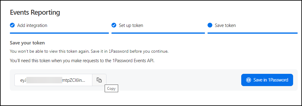 8. To save the token in 1Password, click Save in 1Password and select the vault to which to save your token.