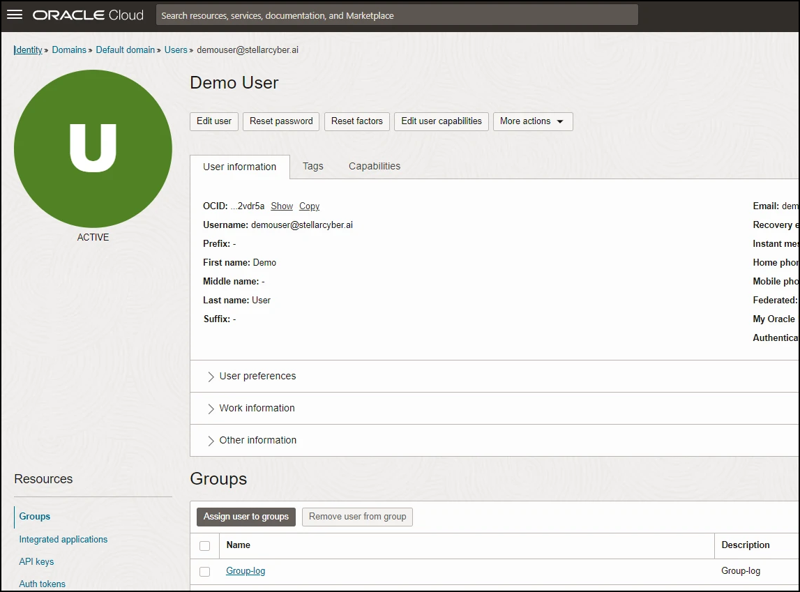5. To create a user, refer to the Oracle documentation for Adding Users, search for Create a user, and follow the procedure. In this example, the user is demouser@stellarcyber.ai. Then, add the user to the group. In this example, the group is Group-log in the Default domain.