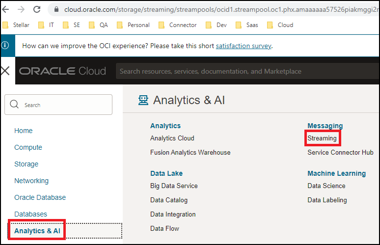 8. To create and configure the Oracle Streaming Service, navigate to Analytics & AI and choose Streaming under Messaging.