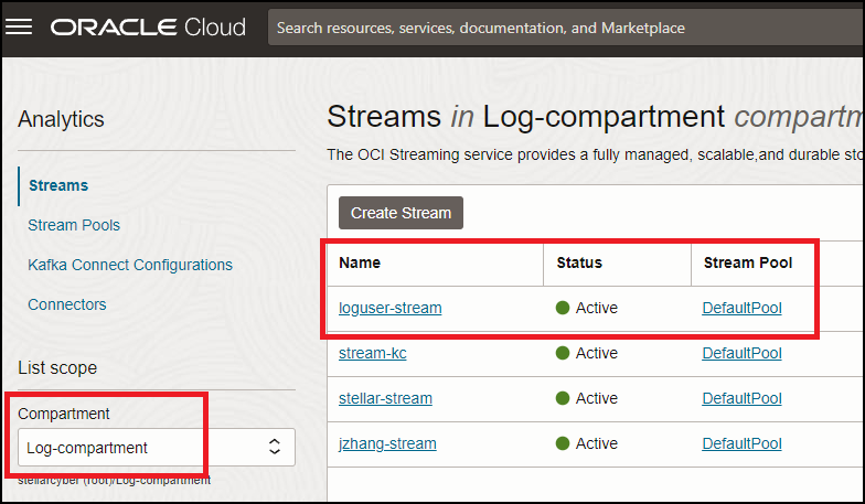 12. Navigate to Streams under Analytics and locate the stream's Stream Pool. In this example, the stream name is loguser-stream and the stream pool is the DefaultPool. The compartment is Log-compartment.