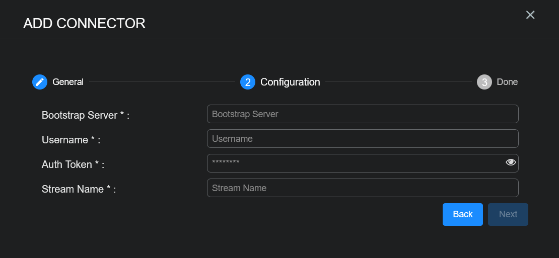 • Bootstrap Server, Username, Auth Token, and Stream Name