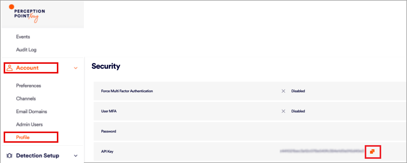 • API Token—The authentication credentials. To generate an API Token Key, follow the guidance in the Perception Point API documentation or in Getting the API Token.