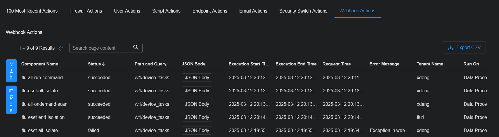 You can view the action status or error message in the table.