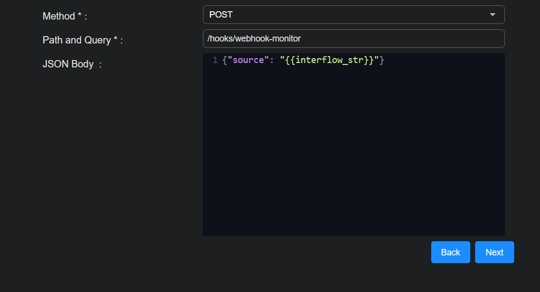 To send the raw Interflow record as the payload of the webhook request as a JSON object, use the following syntax in the JSON Body: {"source": "{{interflow_raw}}"}.