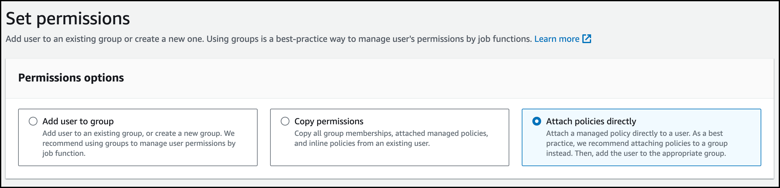 12. On the Set permissions page, choose Attach policies directly. Then search for the policy you created above.