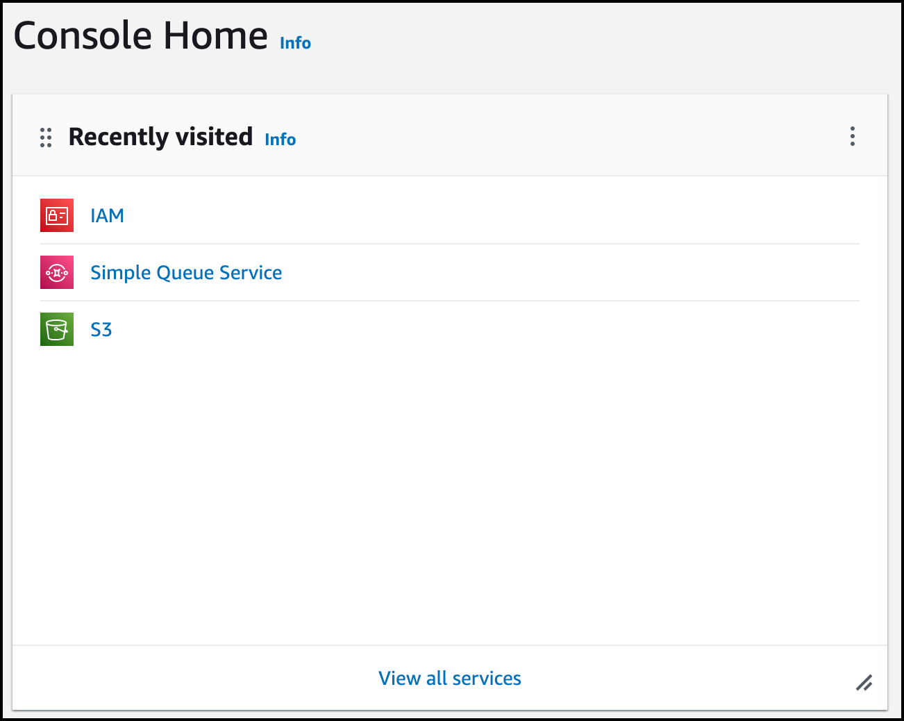 1. Log in to your AWS Management Console at https://aws.amazon.com/console. View the services in the Console Home or choose View all services.
