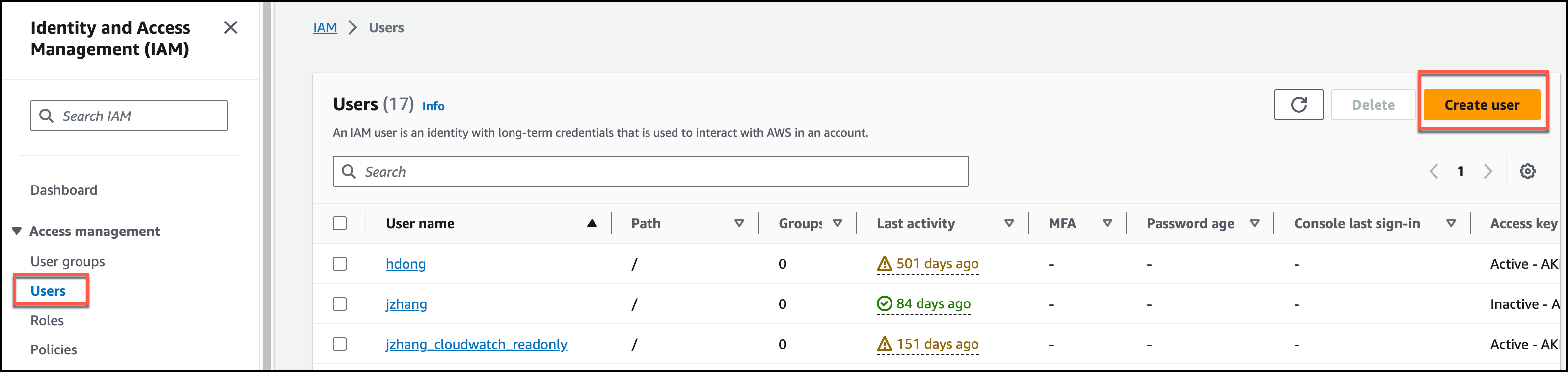 8. From the IAM navigation pane, choose Users and then choose Create user.