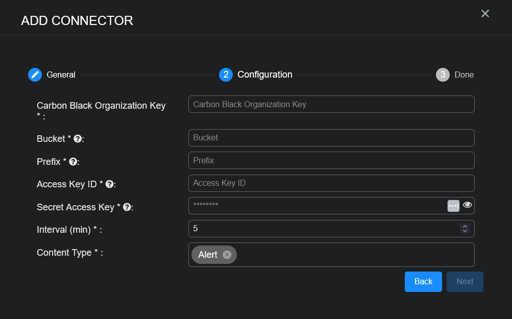 • For Collect: Carbon Black Organization Key, Bucket, Prefix, Access Key ID, and Secret Access Key