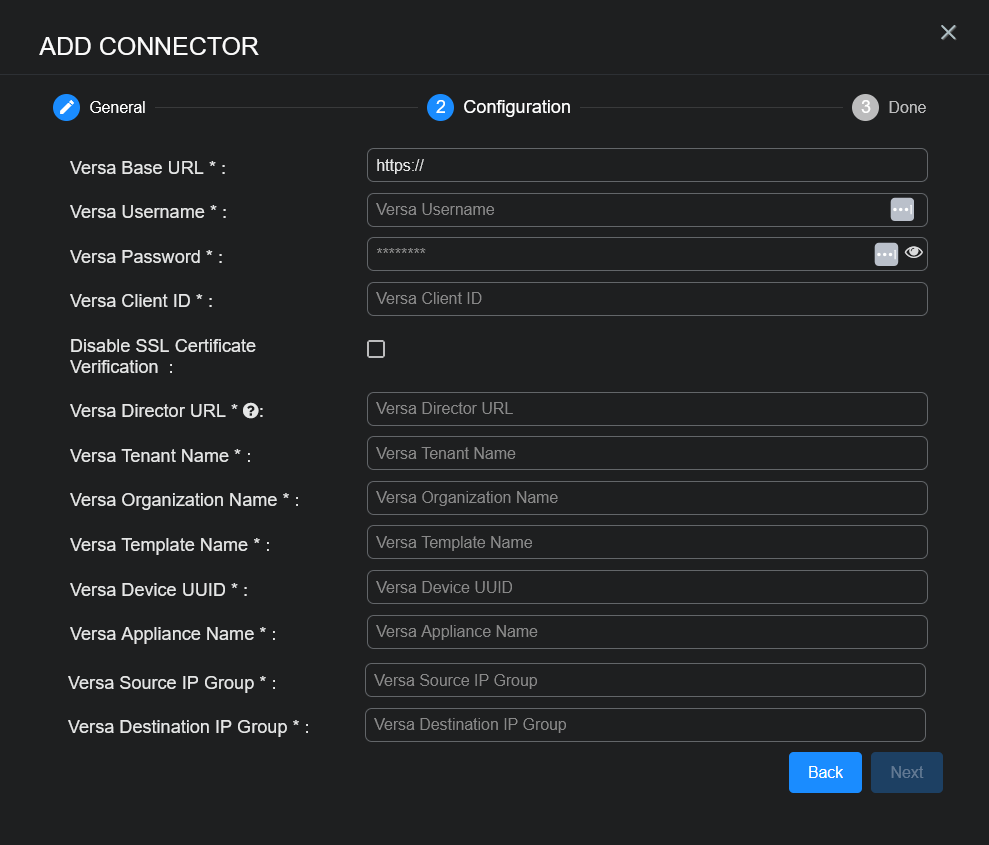 • Versa Base URL, Versa Username, Versa Password, Versa Client ID, Versa Director URL, Versa Tenant Name, Versa Organization Name, Versa Template Name, Versa Device UUID, Versa Appliance Name, Versa Source IP Group, and Versa Destination IP Group