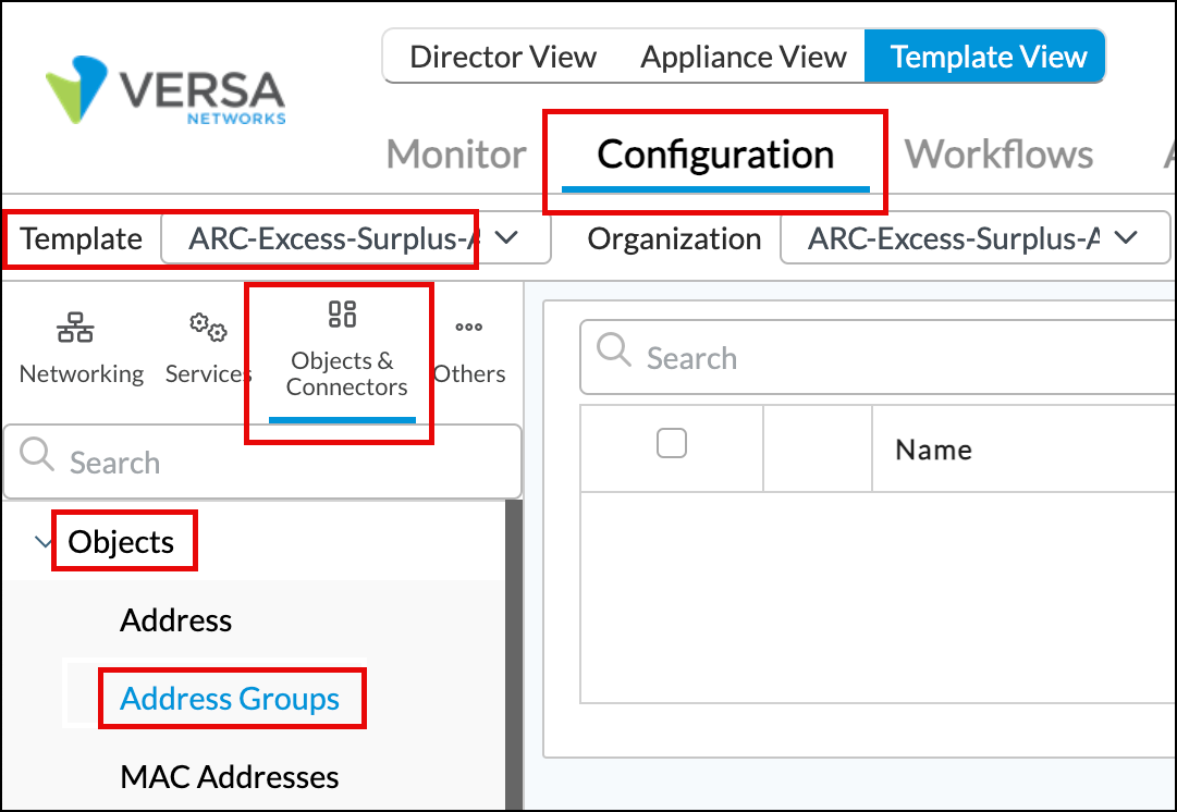 • Versa Source IP Group and Versa Destination IP Group—Address groups used to help block or unblock IP addresses. You can locate them in the Versa Director user interface under Configuration > Templates > <click on corresponding template name> Objects and Connectors > Objects > Address Groups.