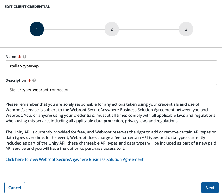 Use the following steps as a guide to obtain the credentials required to allow Stellar Cyber to retrieve data with the Webroot API.