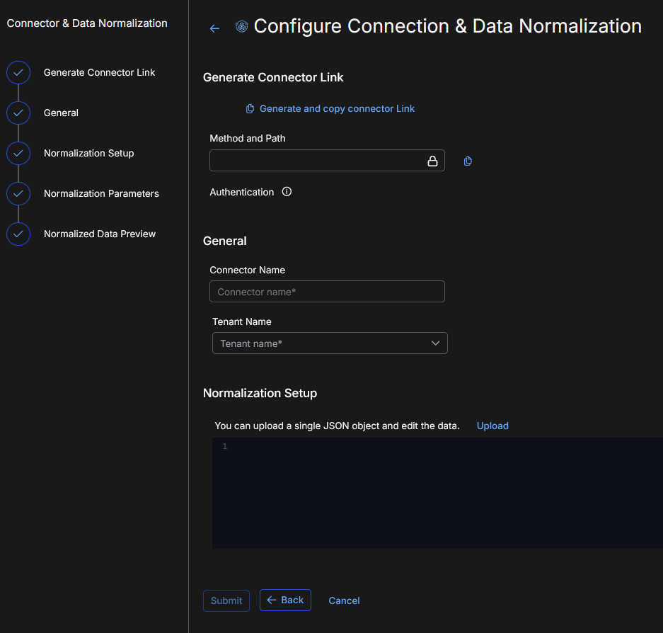 Click Next. The configuration wizard opens to the Configure Connection & Data Normalization page. This page has steps, which are listed on the left-hand side. Use them to configure the webhook connector settings.