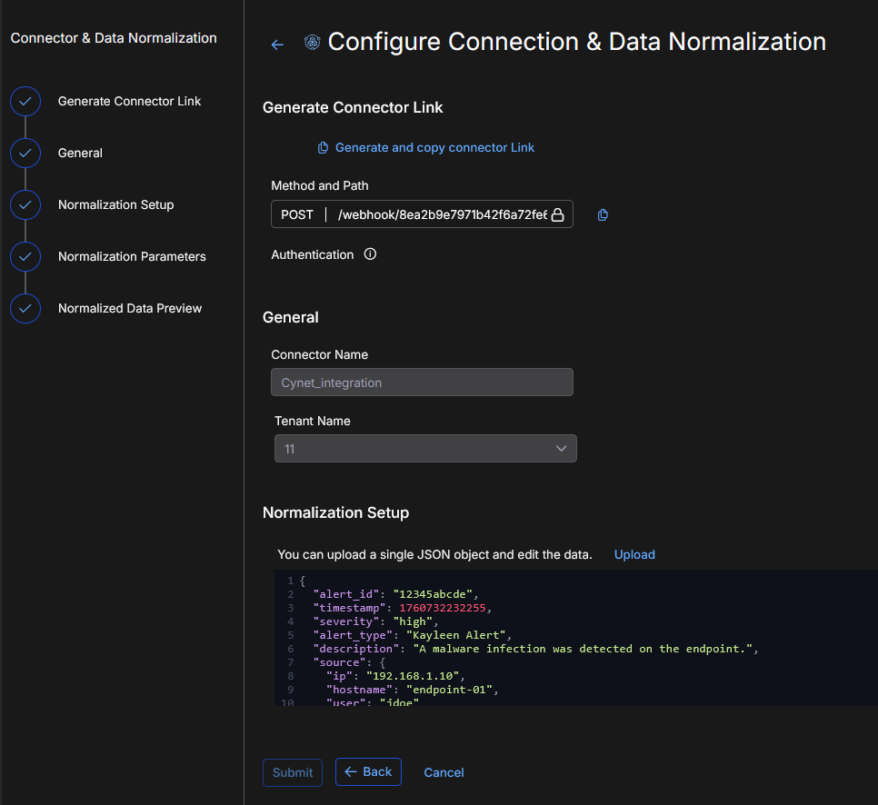 In Generate Connector Link, click Generate and copy connector Link. The system will generate a unique webhook path/link. This is the endpoint where you will post data from third party systems to go into Stellar Cyber.
