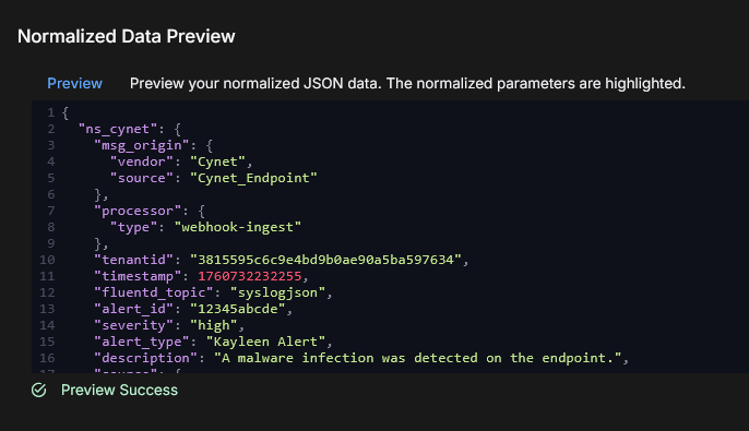 Use the Preview button in Normalized Data Preview to check the JSON syntax and validate the sample data.