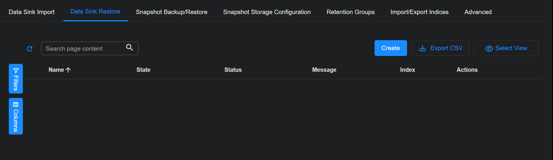 The System | DATA MANAGEMENT | Data Management | Data Sink Restore tab lets you restore data from storage in a Data Sink. You can filter the import on a combination of Tenants, Indices, and a date range.