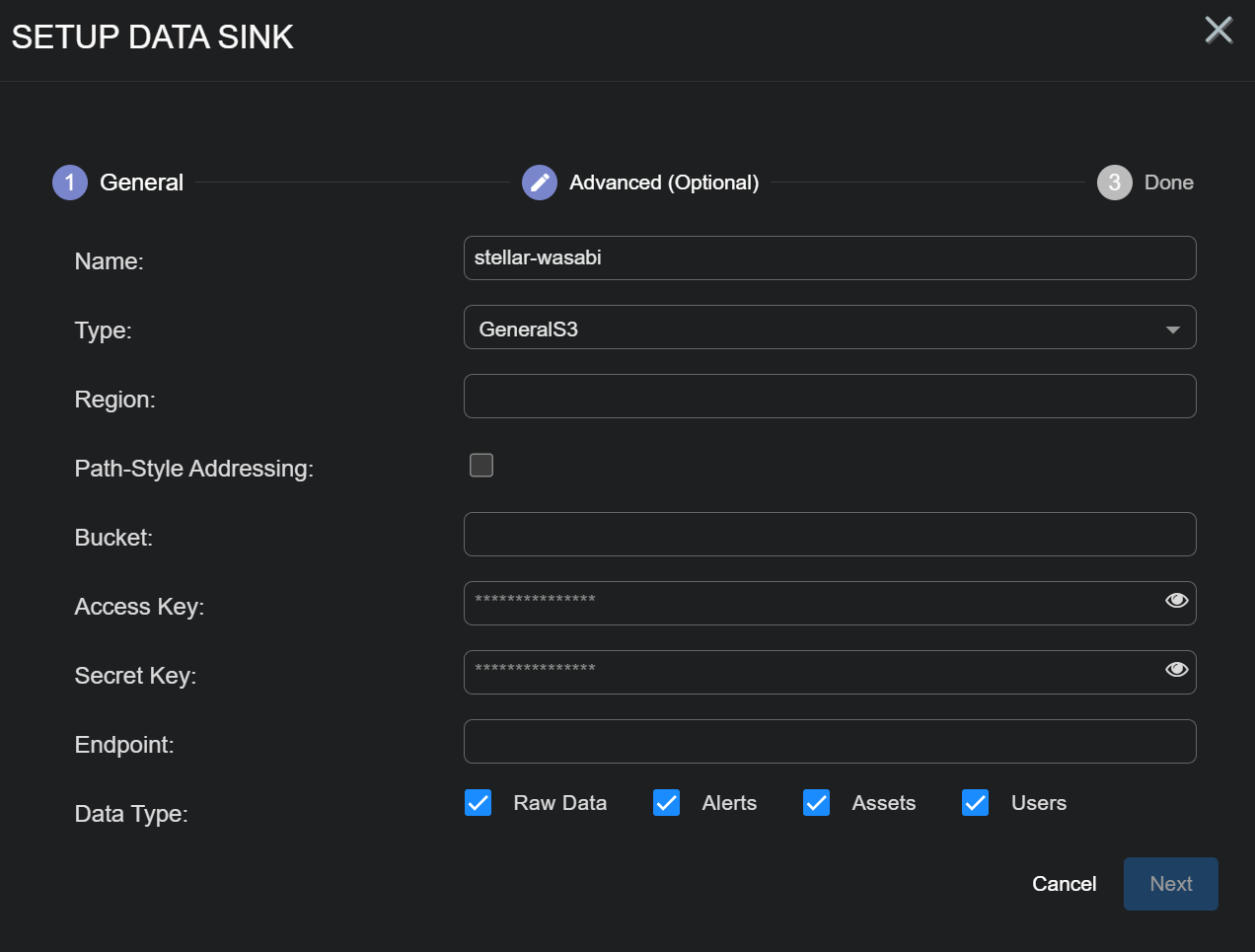 You can use the System | DATA MANAGEMENT | Data Sinks page to add a General S3 Data Sink to Stellar Cyber. A General S3 Data Sink is a data sink that uses any AWS S3-Compatible Storage Service for its storage (for example, wasabi).