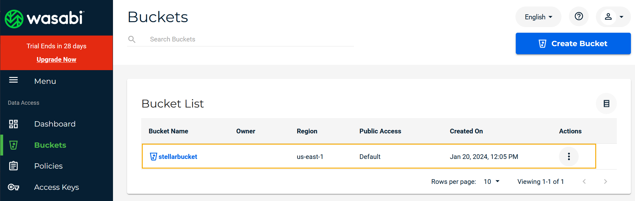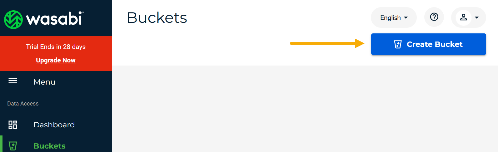 In the wasabi console, navigate to Buckets and click the Create Bucket button, as illustrated below: