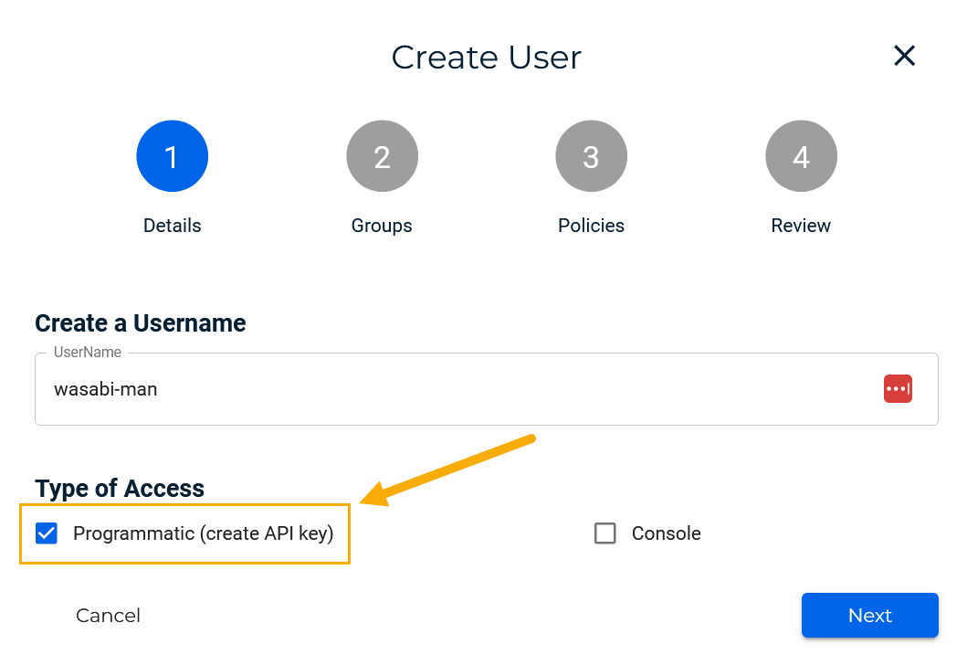 Supply a username, check the box for Programmatic access, and click Next, as illustrated below: