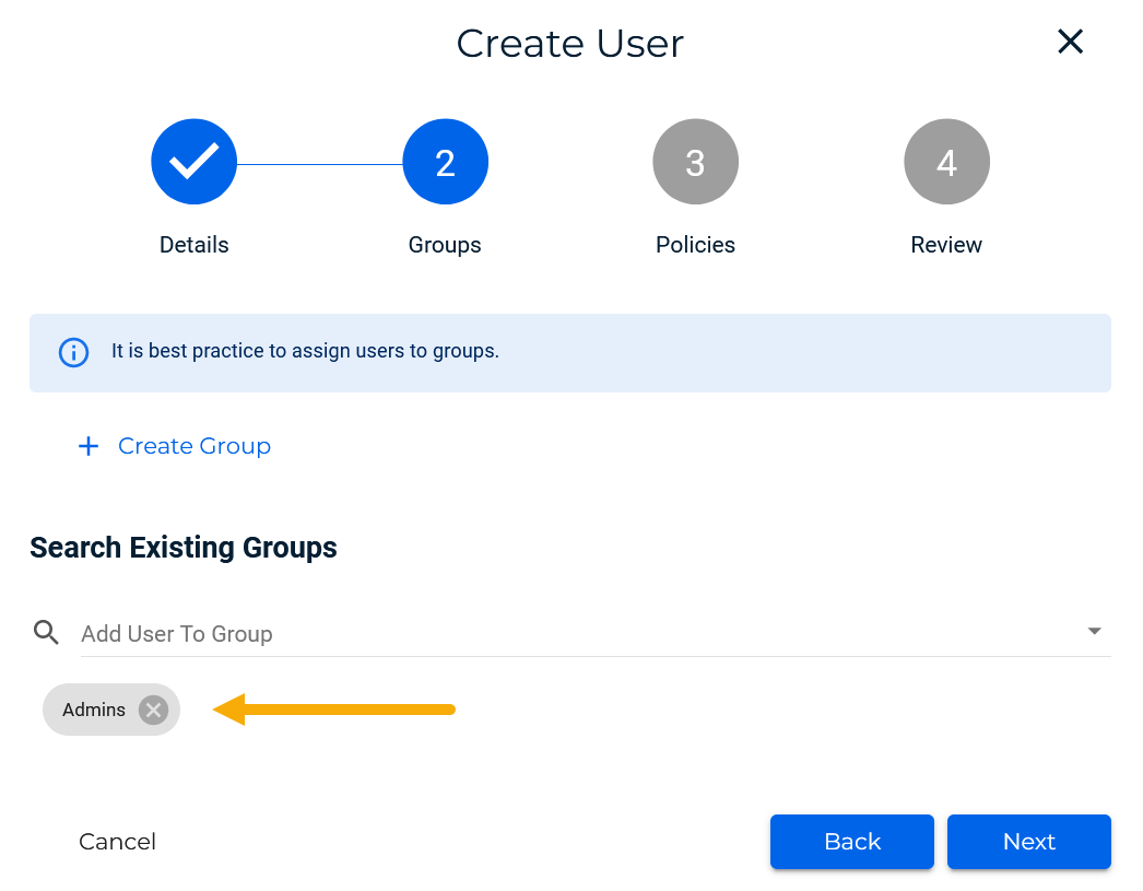 Choose an optional Group for the user and then click Next. We've added our user to the admins group in the image below: