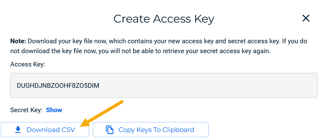 Wasabi provides you with the Access Key and Secret Key for your account. You'll need these later on when you add the data sink in Stellar Cyber, so make sure you click Download CSV to save them.